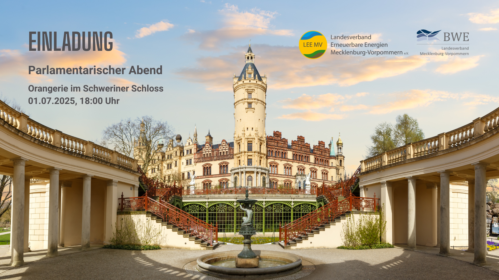 Am 01. Juli 2025 laden wir Sie ab 18:00 Uhr herzlich zu unserem Parlamentarischen Abend in die Orangerie des Schweriner Schlosses ein. Nutzen Sie die Gelegenheit, in einem exklusiven Rahmen das Voranschreiten der Energiewende in Mecklenburg-Vorpommern mit den anwesenden Parlamentarier*innen zu diskutieren und wertvolle Kontakte in den Landtag zu knüpfen.